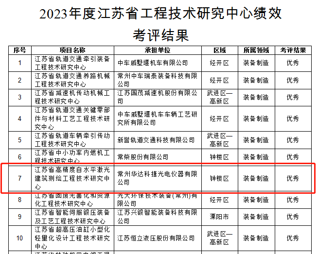 2023/04/07Recently, in accordance with the requirements of "Management Measures of Jiangsu Engineering Technology Research Center" (Su Keji [2006] No. 101, Su Caijiao [2006] No. 24) and "Notice on the Performance Evaluation of Provincial Engineering Technology Research Center in 2023" (Su Keji Letter [2023] No. 7), commissioned by the Provincial Department of Science and Technology, Changzhou Science and Technology Bureau conducted the performance evaluation of 155 provincial engineering technology research centres in the jurisdiction. The performance appraisal of 155 provincial-level engineering and technology research centres under the jurisdiction of Changzhou Science and Technology Bureau was carried out. After the process of material declaration, formal review, expert evaluation and due diligence, the "Jiangsu High Precision Self-Level Laser Building Mapping Engineering Technology Research Center" owned by our company won the excellent performance evaluation!